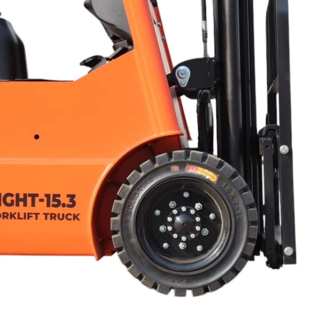 Прочные цельнолитые шины и четырёхколёсное исполнение делают погрузчик устойчивым на разных типах покрытий, включая бетон и асфальт. Радиус поворота 2200 мм и компактные габариты (длина с вилами 3300 мм, ширина 1096 мм) позволяют эффективно работать даже в стеснённых условиях склада.
